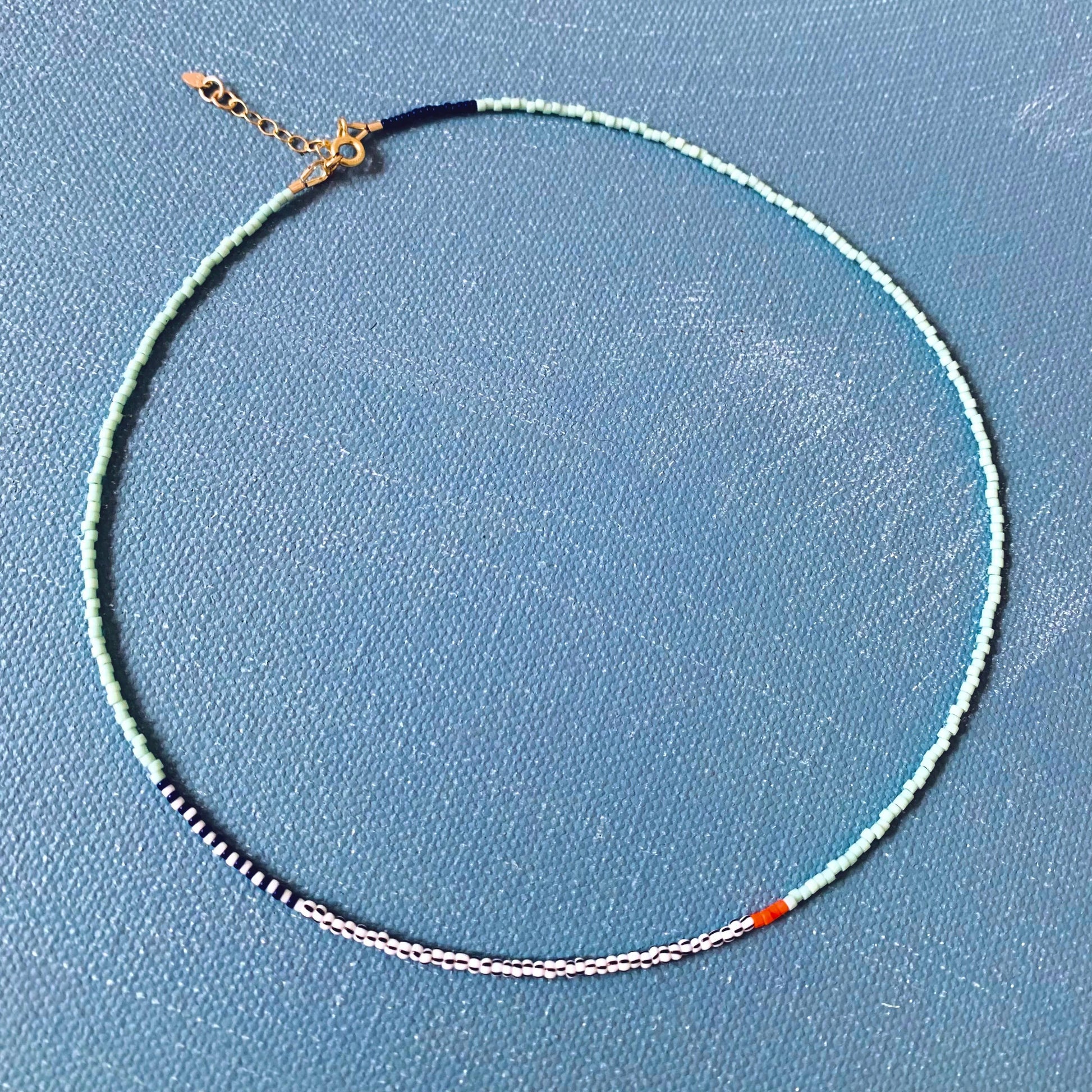 The Thinnest Line series is the most delicate, lightweight splash of color. Materials: Japanese glass beads, brass beads, nickel-free 14k gold-filled clasp and extender chain Dimensions: 15-16"