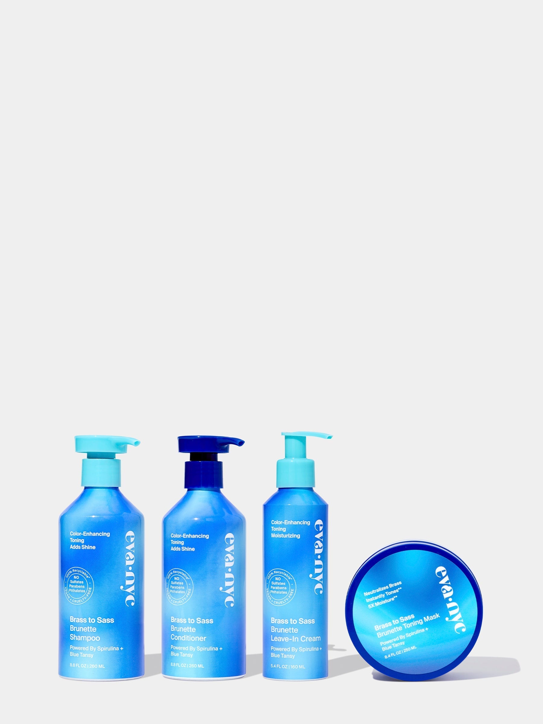 I'm the Brass to Sass Brunette Collection Set �C here to deliver rich, dimensional brunette hair that's soft, hydrated, and frizz-free! My shampoo and conditoner's bright blue hues neutralize brassy red and orange tones to bring out deep brunette color in just one wash, while our blue-tinged leave-in cream enhances color, tames flyaways + refreshes dry ends! My deep conditioning hair mask is the perfect treatment to extend time between hair color touch-ups, enhancing brunette color, toning, and hydrating for salon-fresh color, every time.