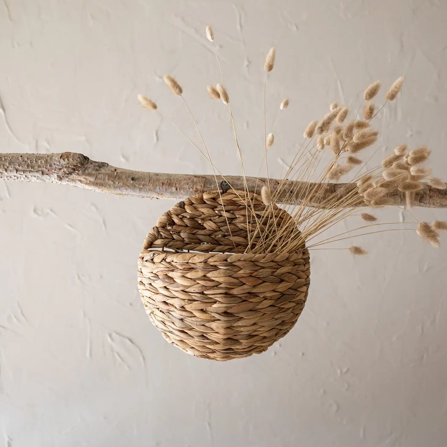 This beautiful hand-woven wall pocket is made with water hyacinth fibers that are intricately woven around a metal structure for sturdiness.