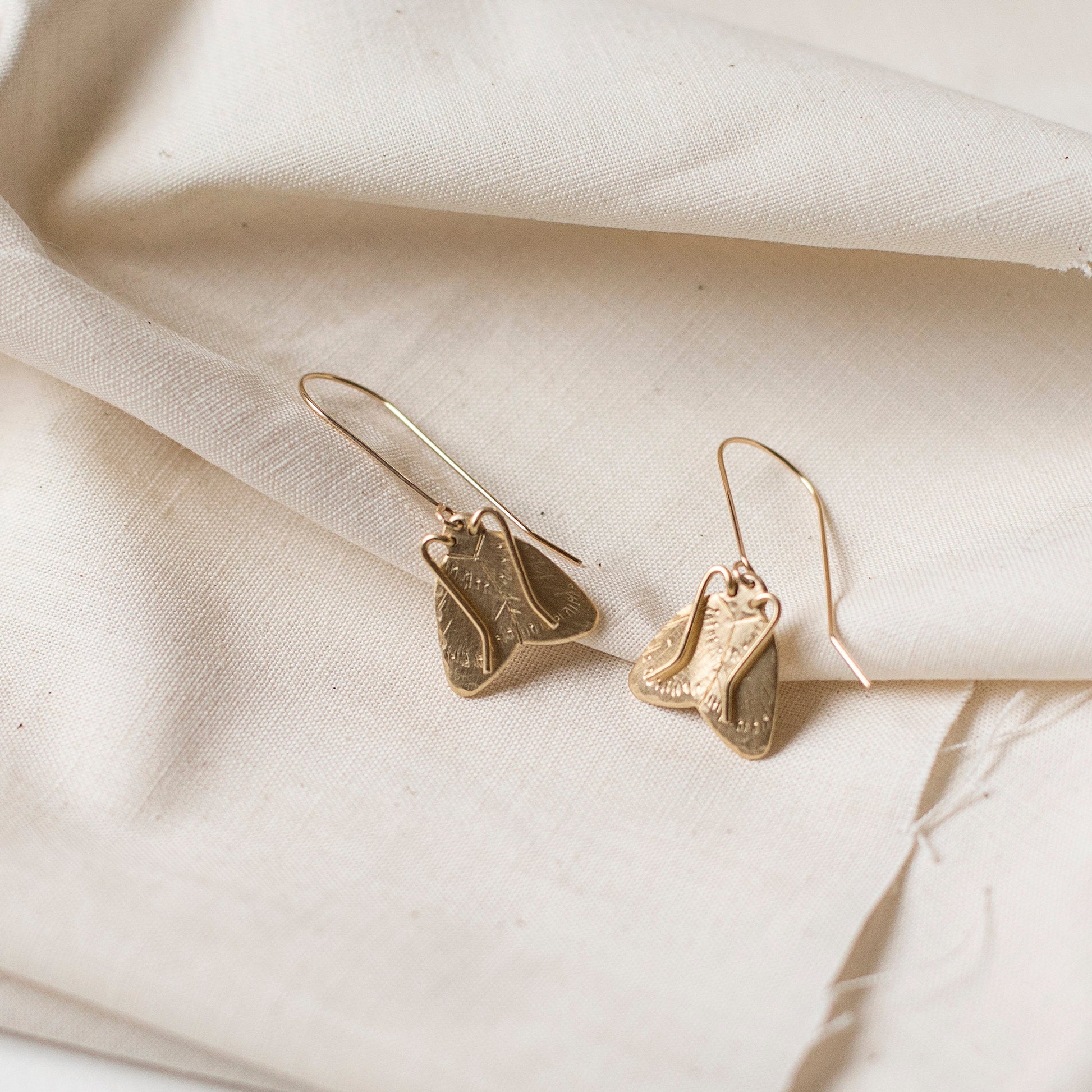 Small moth earrings made into dangle earrings. Created with solid brass, hand stamped detail, complete with tiny antenna! High shine finish, sterling silver posts and backs. 1" tall and 1" wide.