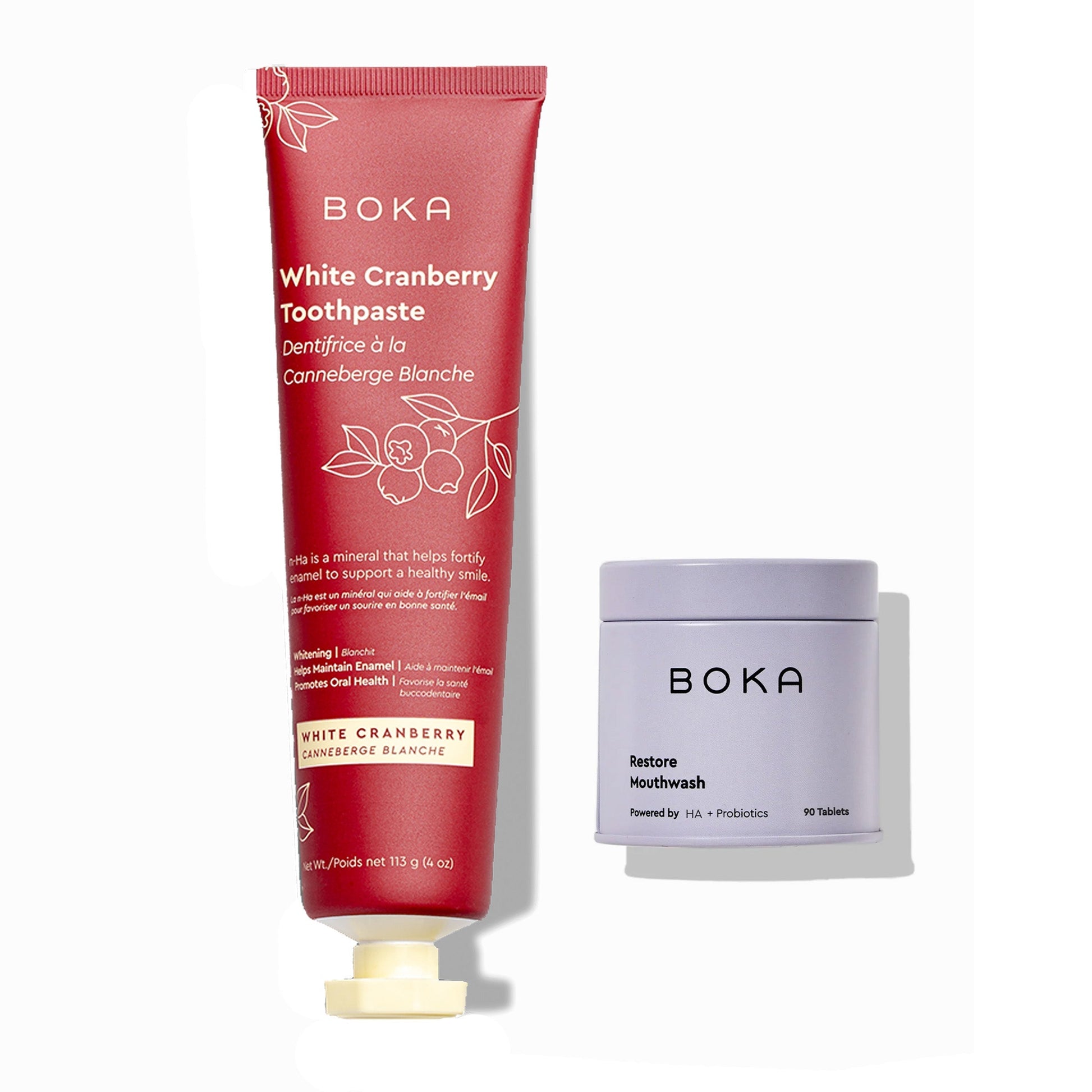 鈥楾is the season to level up your oral care. This bundle is the perfect intro to what makes Boka special, starting with our n-Ha Toothpaste in limited-edition seasonal White Cranberry flavor. This power-packed toothpaste trades fluoride for nano-hydroxyapatite (n-Ha) to remineralize and fortify teeth with every brush. It freshens breath, whitens teeth, and even helps close holes on enamel that can cause tooth sensitivity. Our waterless Restore Mouthwash tablets pack a powerful punch of probiotics to restore your oral microbiome. Plus, this travel- and environmental-friendly mouthwash freshens breath, soothes irritated gums, and further helps to remineralize teeth 鈥?all without the burn.