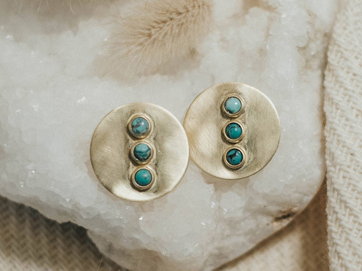 Solid brass disc with 4mm turquoise pieces on sterling silver studs.