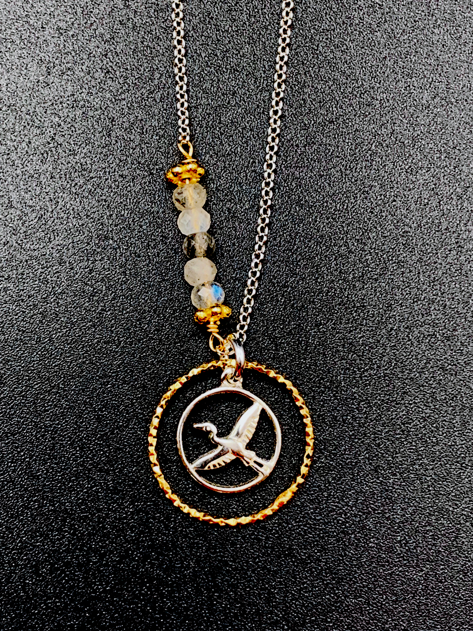 This necklace features a sterling silver Canadian heron in flight, encircled by a gold vermeil hoop. The chain is accented with labradorite.