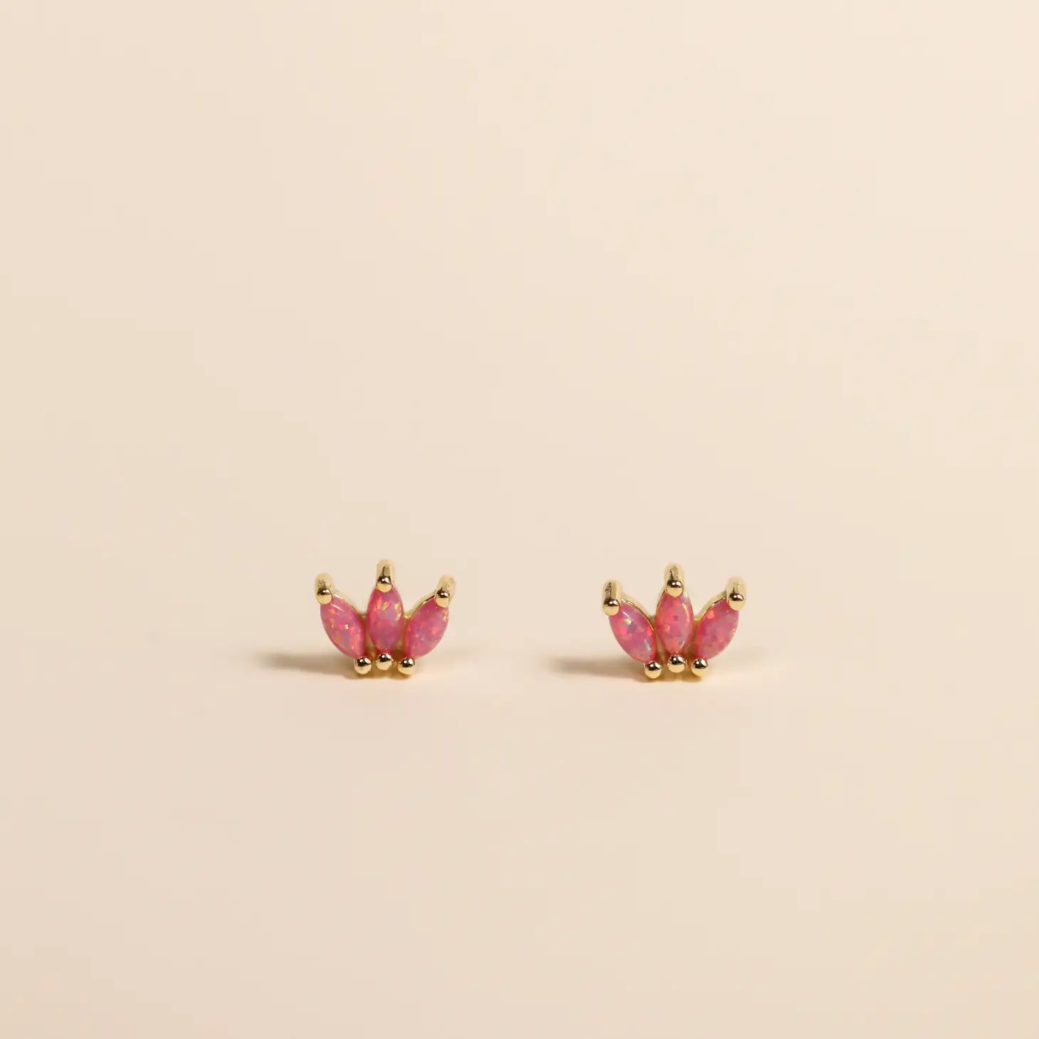 Pink opal stones set in a small crown set. Perfect for a pop of color on any occasion. Pink synthetic opal stone, 14kt gold vermeil over 925 sterling silver. Width 6 mm - Straight bar post with backing.