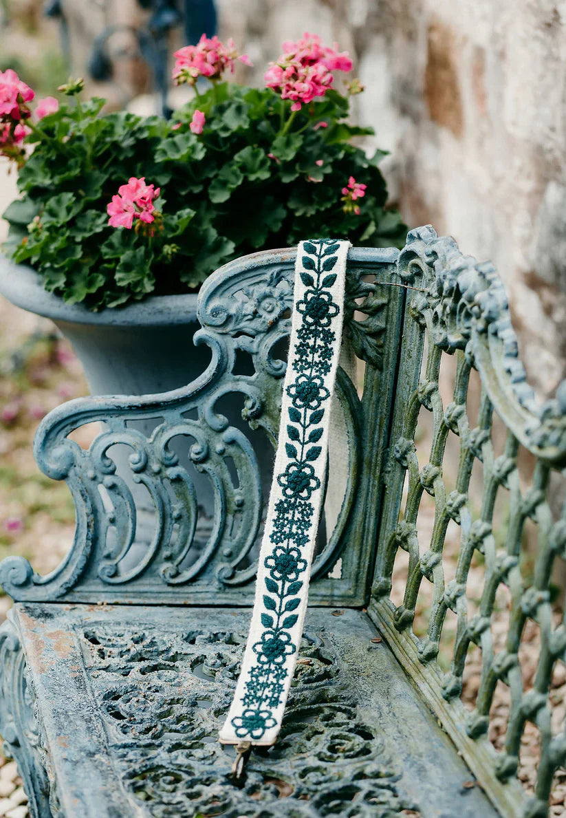 Hand loomed cream wool fabric with dark green floral and leaves design. Non-adjustable and works well with larger purses. Pairs perfectly with any clear purse for game day. Hand embroidered by Fair Trade artisans in the Andes mountains of Peru.