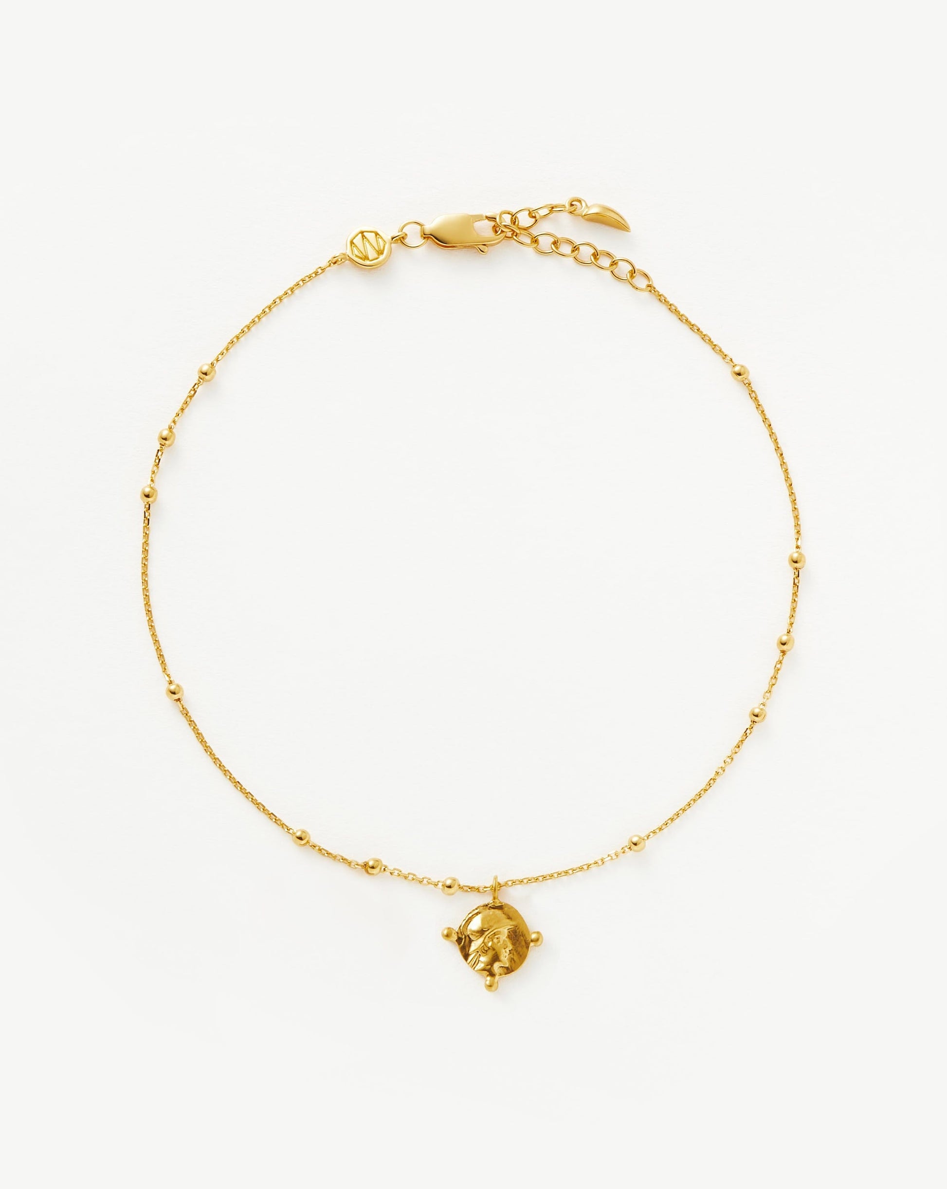 This chic anklet takes inspiration from ancient Roman iconography and gives it a modern point of view. An 18ct gold-vermeil coin, depicting an ancient Roman icon, is strung from a beaded gold chain.