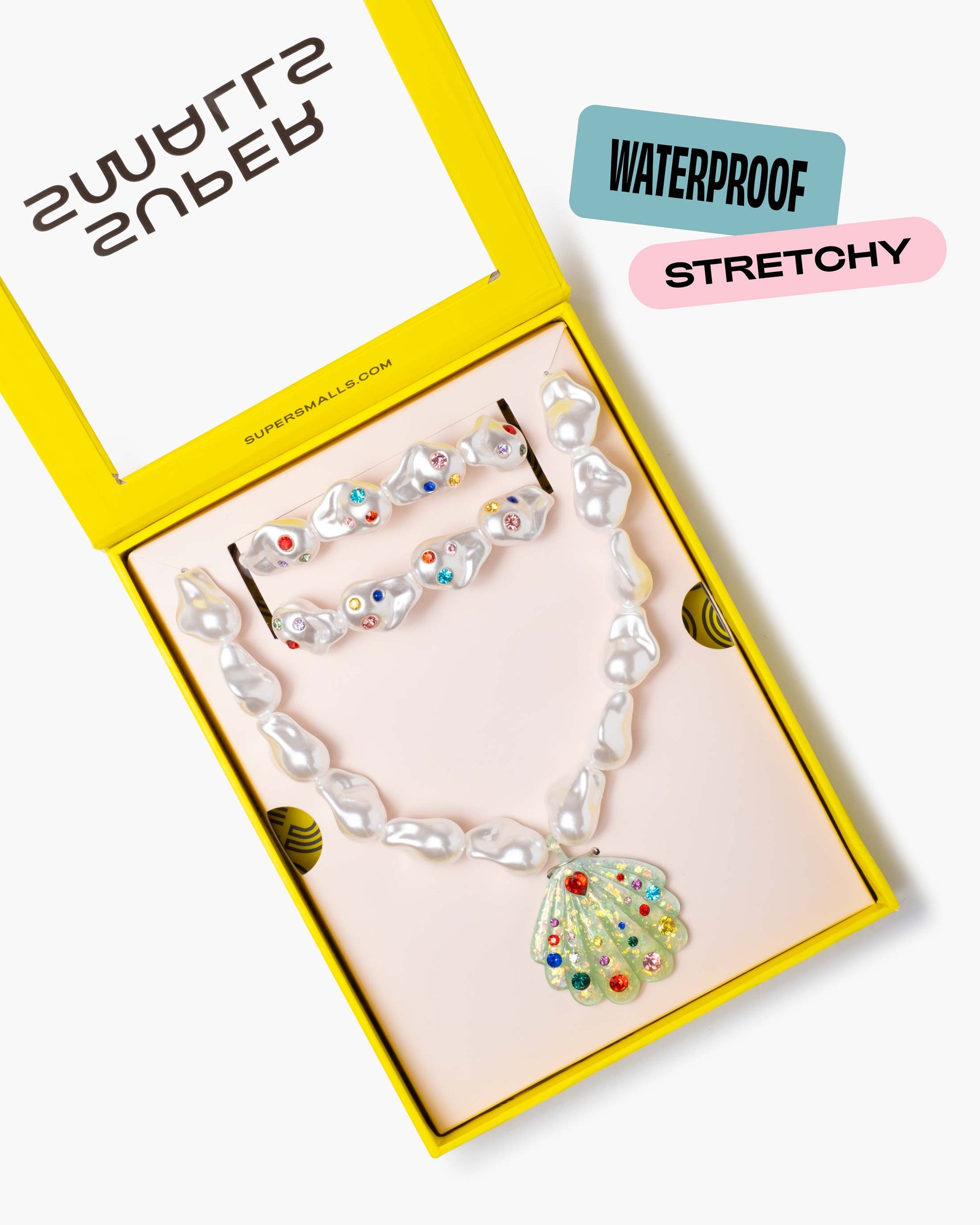 Everyone dreams of becoming a mermaid—they dive and dance through the ocean! Now you can channel their sparkly vibes in and out of the water all day. This magical, summery set was dreamed up and designed by Luna, our Kid-in-Chief. Featuring “freshwater pearls” and a gem-covered sea shell, these stretchy jewels are made for easy on-and-off and for getting wet (but try to keep that goopy sunscreen away from your precious gems)!