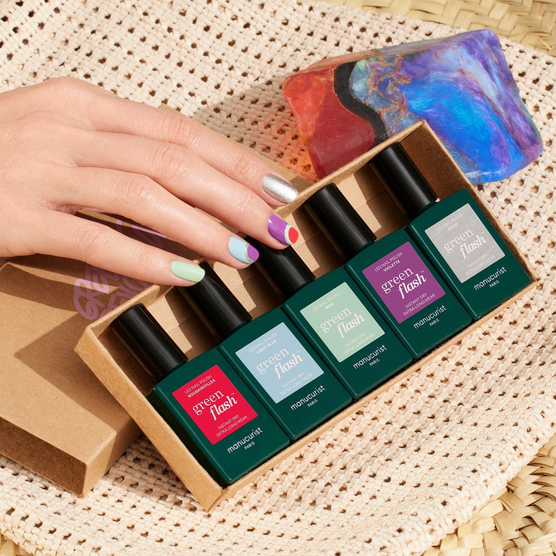 Brushes at the ready! This set contains all the products you need to create the Retro Rainbow nail art in our Summer Love collection: 5 Green Flash? or Green colors (Disco, Bougainvillea, Violette, Light Blue and Mint).