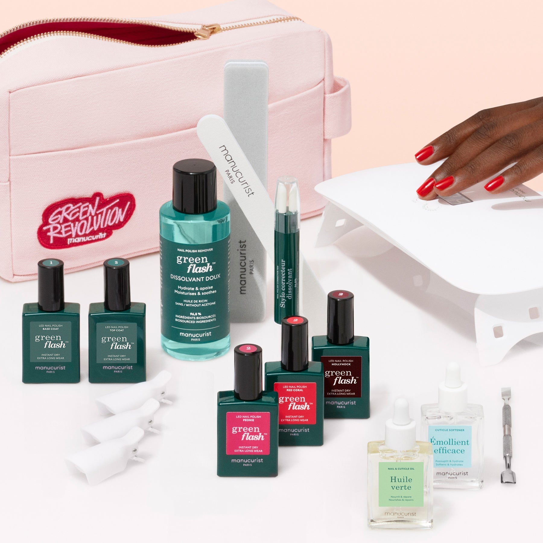 Our most complete kit that includes all the essentials for a Green Flash? LED gel polish alternative system, complete nail prep, with a FREE bag to hold everything in!